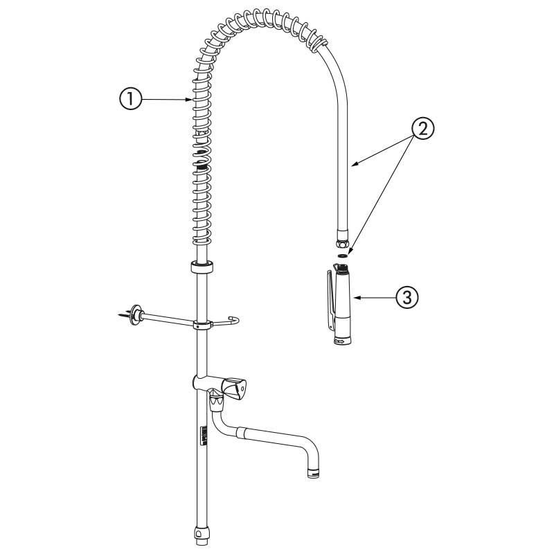 Este modelo de conjunto, sem torneiras, é composto por peças de substituição para a renovação dos dispositivos de pré-lavagem.