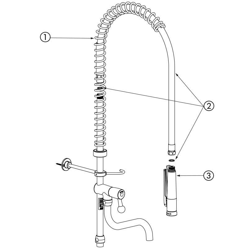 Este modelo de conjunto, sem torneiras, é composto por peças de substituição para a renovação dos dispositivos de pré-lavagem.