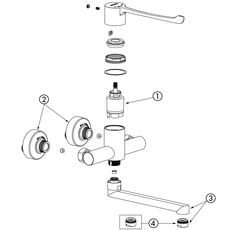 Bica plana fixa inferior L.200 mm com quebra-jatos higiénico adaptado para a colocação de um filtro terminal BIOFIL.