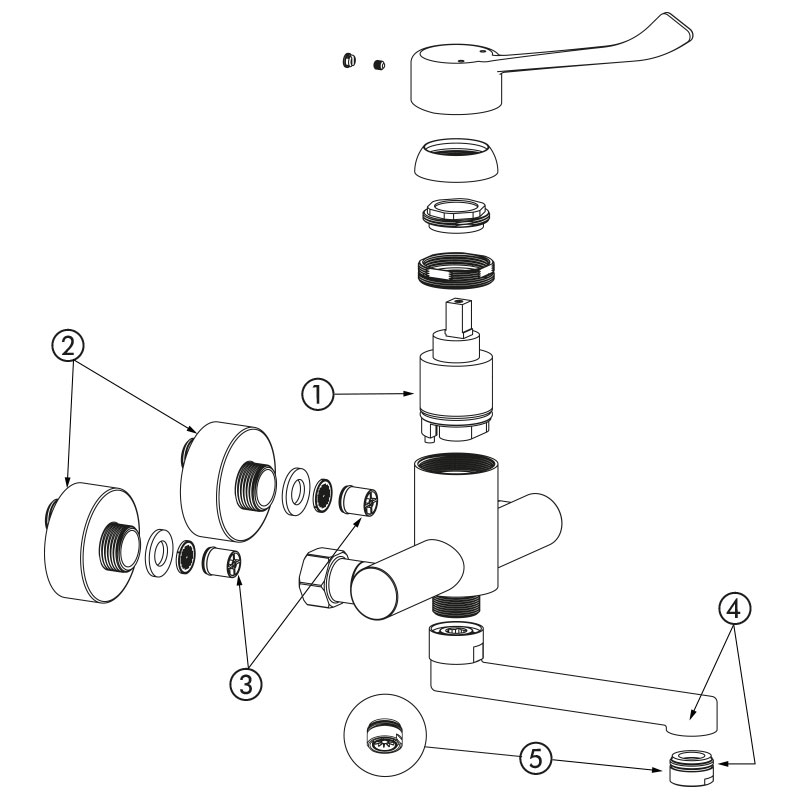 Misturadora de parede com bica plana orientável inferior L.150 com quebra-jatos higiénico adaptado para a colocação de um filtro terminal BIOFIL.
