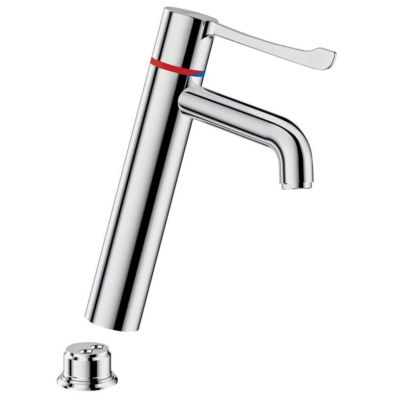 Misturadora termostática particularmente adaptada para estabelecimentos de cuidados de saúde, lares, hospitais e clínicas.