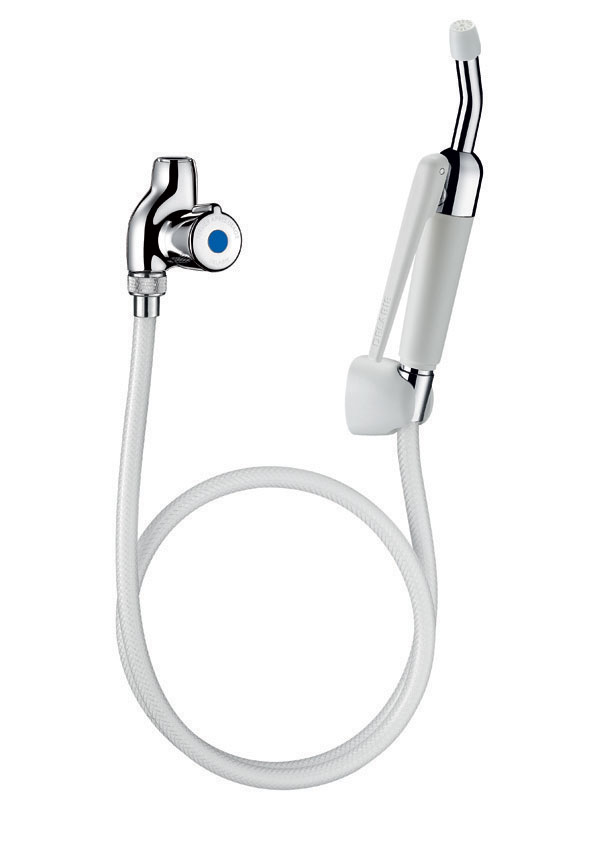 Chuveiro de mão HOSPITAL com gatilho invertido: em débito se o gatilho for libertado (deve ser fechada a torneira de segurança no fim da utilização para evitar o risco de pressão constante no flexível).